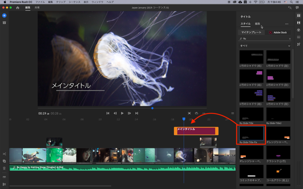 追加されたモーショングラフィックスを選択すると、右側の「タイトル」、「編集」タブからテキストの変更や、文字色、フォントサイズに加えて、シェイプの色などの調整を行うことが出来るようになります。