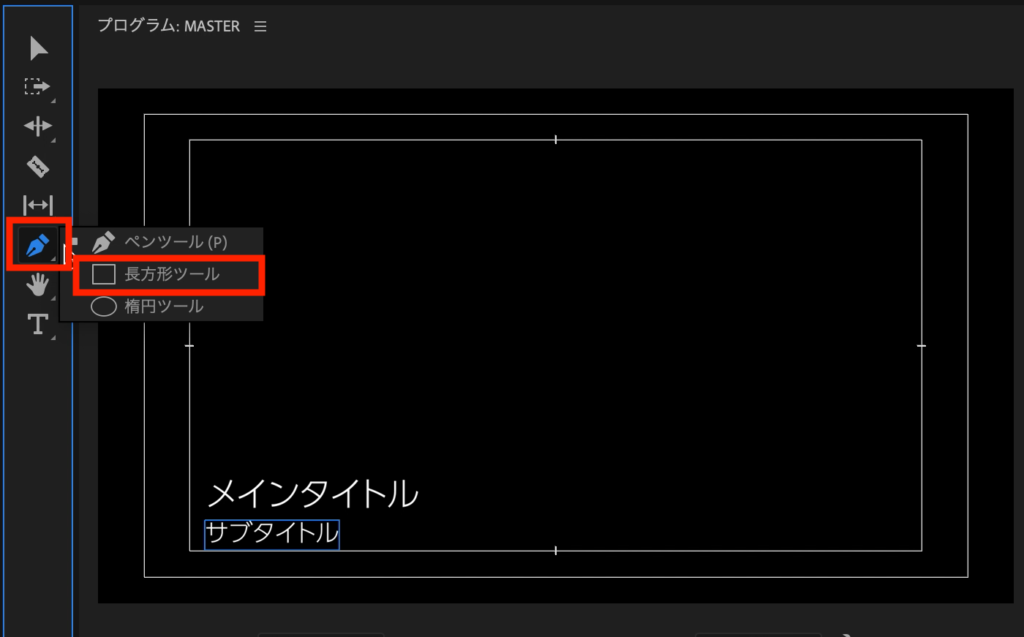 「メインタイトル」と「サブタイトル」の間にボーダーを加えましょう。ツールバーからペンツールの右下を長押しで長方形ツールを選択し、タイトルの間に細い長方形を追加します。