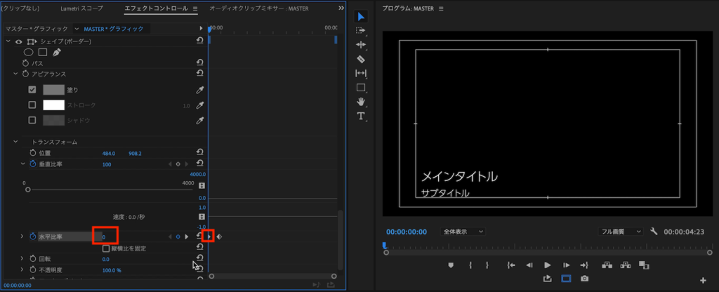 今度はタイムインディケーターを0秒に移して「水平比率」の数値を「0」に変更します。