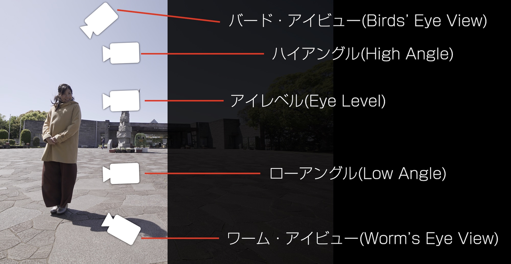 なお、カメラアングルは日本と海外の呼び方に多少の違いがあります。こちらの記事では海外式のもの含めて紹介していきます。