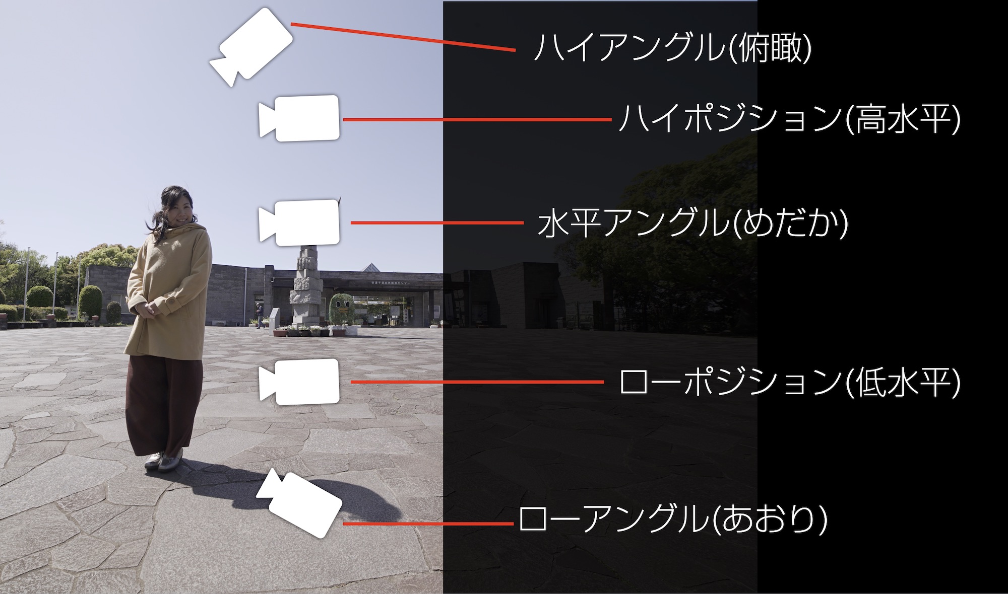 カメラアングルとはカメラから見て、被写体を水平または下から撮るか、上から撮るなど「カメラ角度」のこと。撮る角度によっては被写体に与える印象がガラッと変わるので使い分けるようにしましょう。
