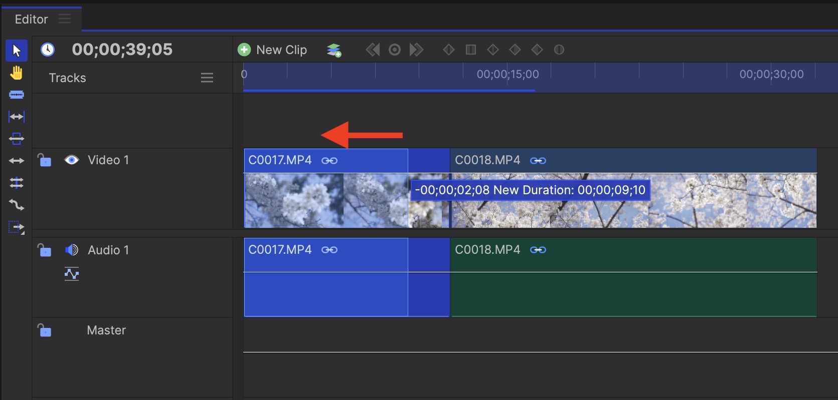 Editor(エディタ)の一番左のあるツールバーの「Select Tool(選択ツール)」はタイムライン上でクリップを動かしたり、選択が出来るようにするものですが、クリップの左右をドラッグすることでリップル編集が行えます。