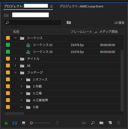 プロジェクトウィンドウの中にはフッテージ、BGM、サウンドエフェクト、AE、シーケンス、タイトルなどのビンを用意しています。