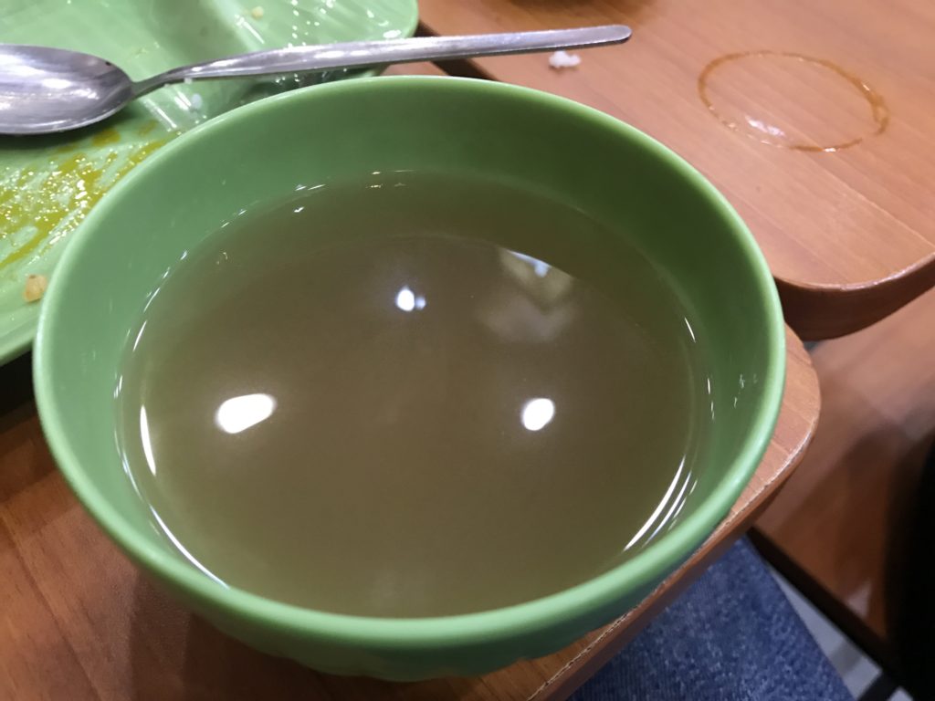 セットメニューをオーダーすると、小さいボウルに入ったスープも提供されます。こちらはシニガンスープになっており、酸っぱめに作られています。ご飯を多く食べたいという方には良い口直しになると思います。